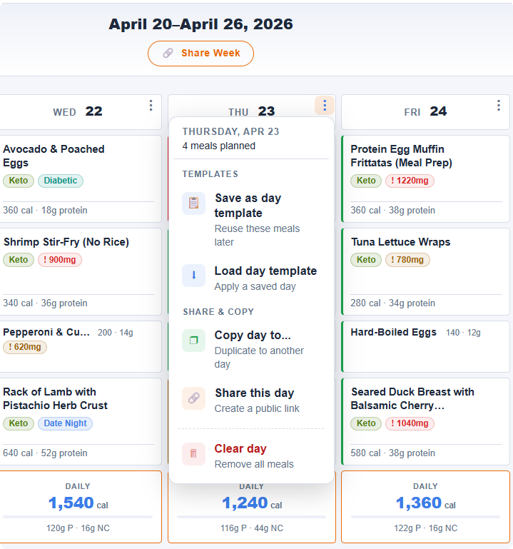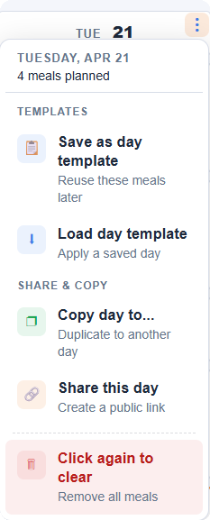 Built a great Tuesday and want the same meals on Friday? Open the day\u2019s kebab menu (the \u22ef icon in the top-right of the day column), pick Copy day to\u2026, then tap the day you want to copy to.