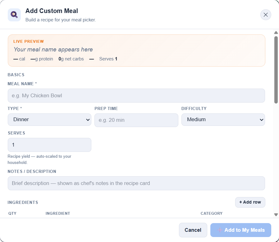Click Add Meal in the header to open the custom meal editor. The editor has four parts that each do a lot of heavy lifting: