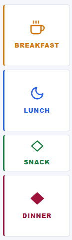 Each filled meal card shows key info at a glance. A colored left border tells you the meal type (amber = breakfast, blue = lunch, green = snack, burgundy = dinner). Small icons show diet tags and health badges. The calorie and protein count sits at the bottom of the card.