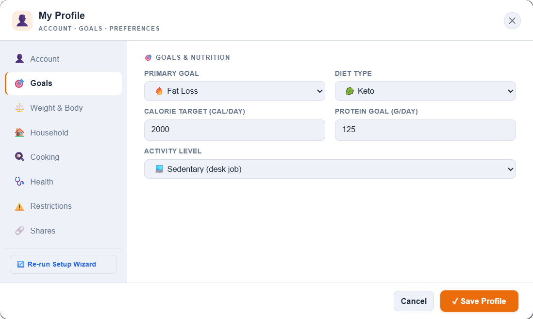 Open your avatar menu (top right) and click Profile → Goals. Enter your daily calorie target, protein target, primary goal, and diet type - or let the engine derive your calorie and protein targets from your weight goal, activity level, and body metrics on the other Profile tabs.