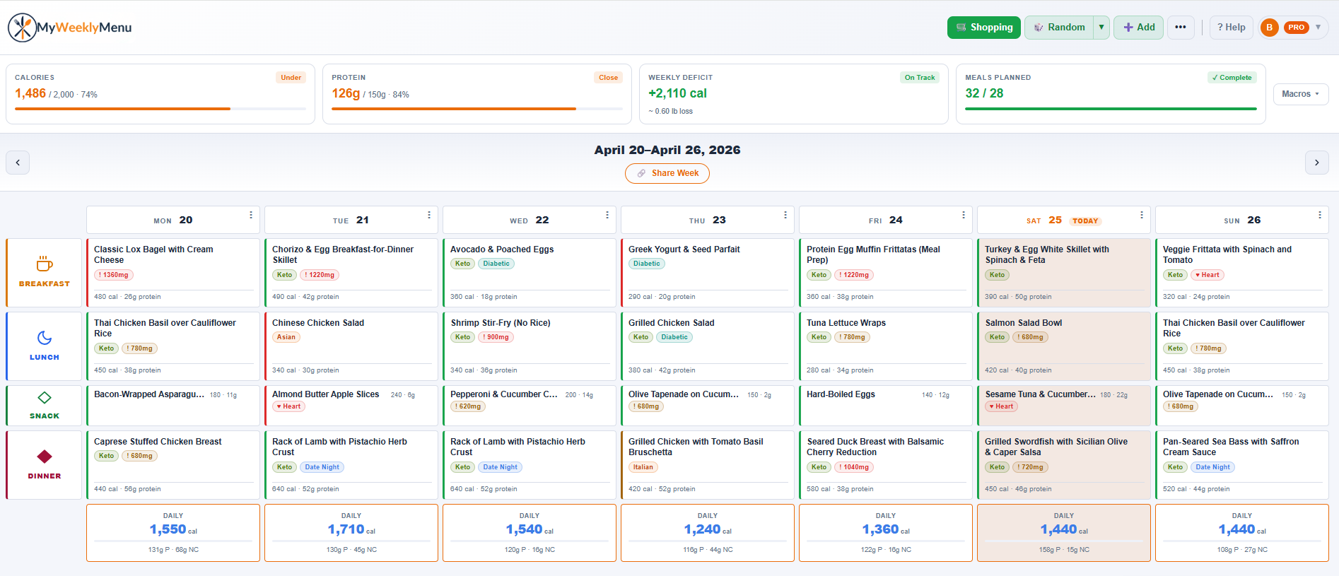 Every meal has pre-loaded nutrition data. The stats bar, Goals panel, and the Weekly Nutrition Summary all update automatically as you plan \u2014 so you always know where your week stands.