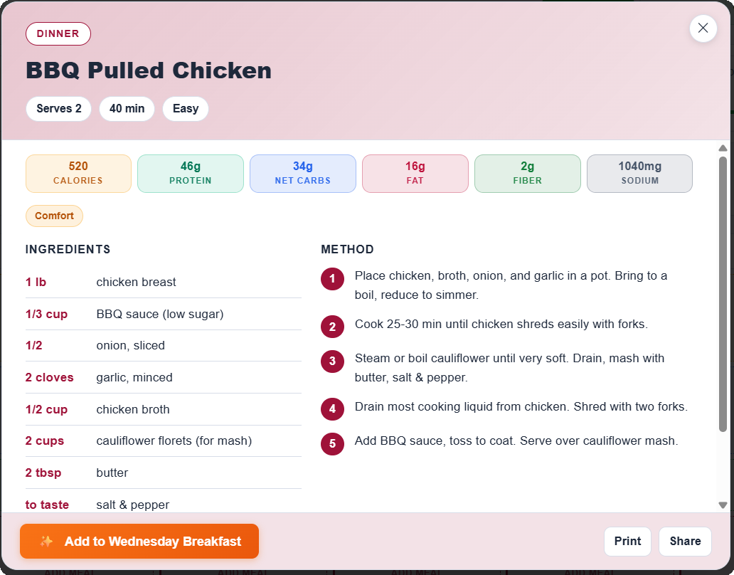 Click any meal card in the planner to open the recipe viewer. This shows the complete nutrition breakdown, ingredient list (already scaled to your household size), and step-by-step preparation instructions for that recipe.