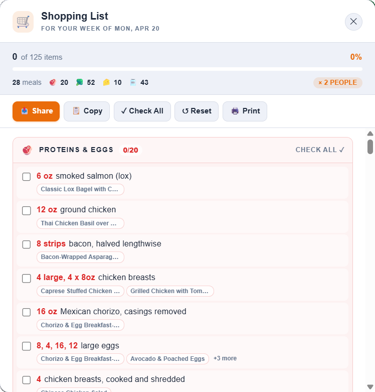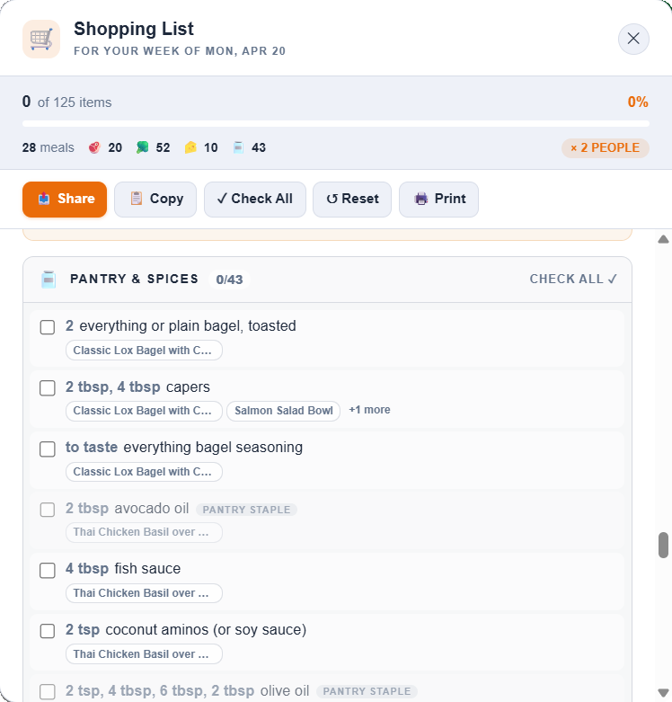 A sticky progress strip at the top of the list shows your overall completion bar plus a meal coverage row \u2014 how many meals in the plan are fully covered by checked-off ingredients.