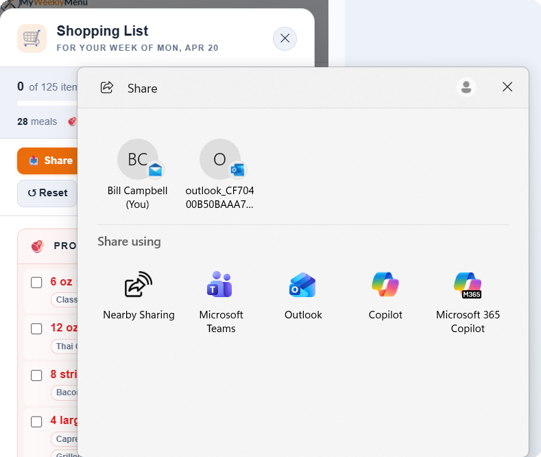 Click Shoppingin the header. The list builds automatically from whatever meals you have planned for the current week. If you haven’t planned the full week yet, the list reflects only the meals you’ve added so far.