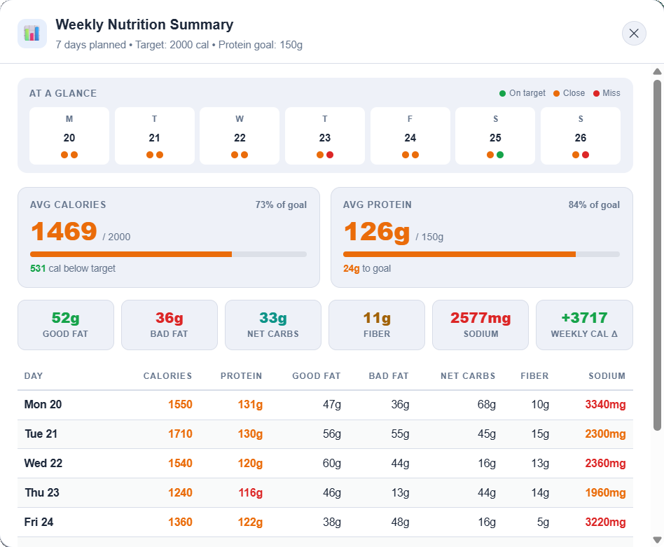 Click Summaryin the header to open the nutrition dashboard for your planned week. It’s built as a top-down scan: