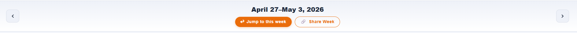 Use the chevron arrows on either side of the week title to move forward or backward through weeks. Each week is stored independently, so you can plan ahead or look back at previous weeks. Click Today (the small pill below the week title) to jump back to the current week at any time.