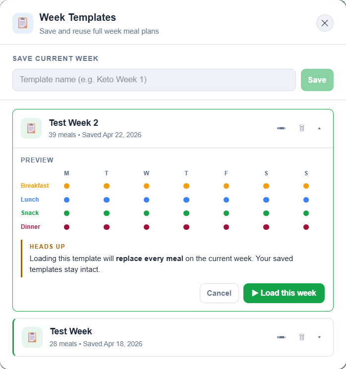 Load day template \u2014 drops a saved day into the current day column, replacing whatever was there.
