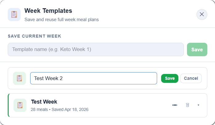 Free users can save 1 week template. Pro unlocks unlimited saved weeks.